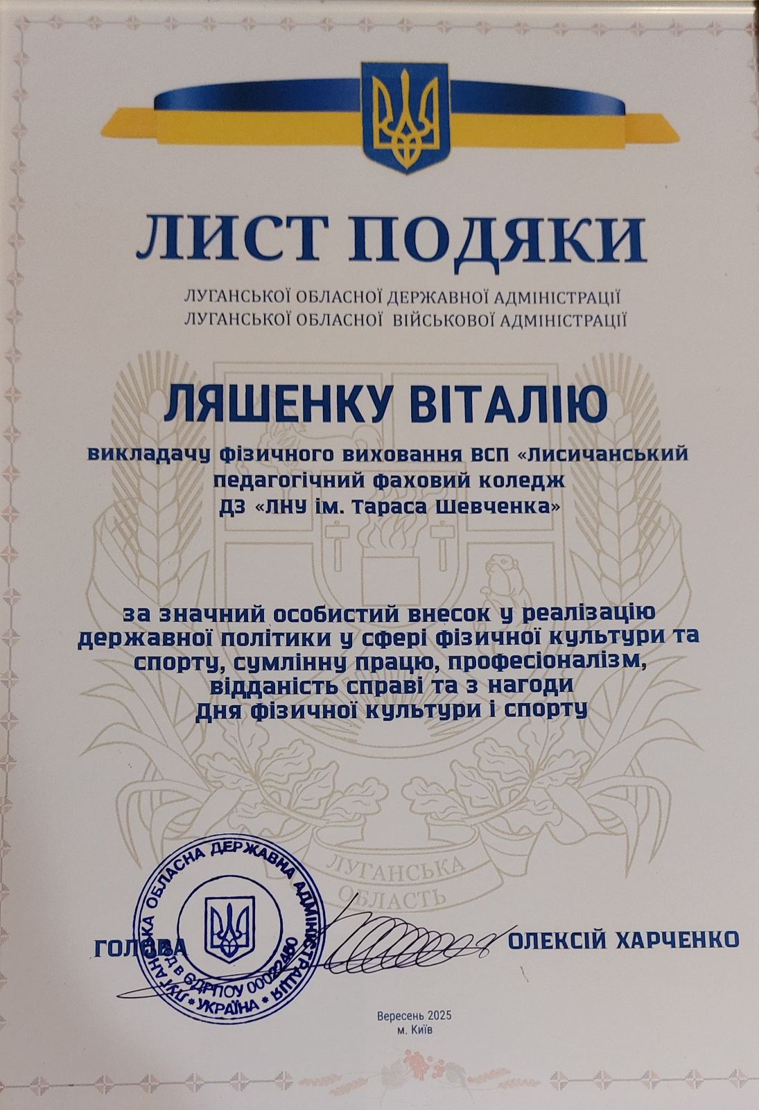Учасники отримали державні нагороди та обласні відзнаки за високі досягнення, професіоналізм і відданість розвитку фізичної культури. Серед нагороджених — викладач ВСП «Лисичанський педагогічний фаховий коледж» ДЗ «Луганський національний університет імені Тараса Шевченка» Віталій Ляшенко.