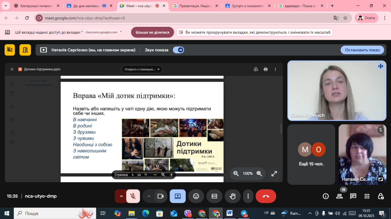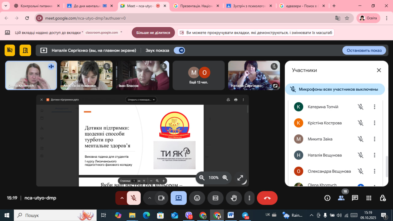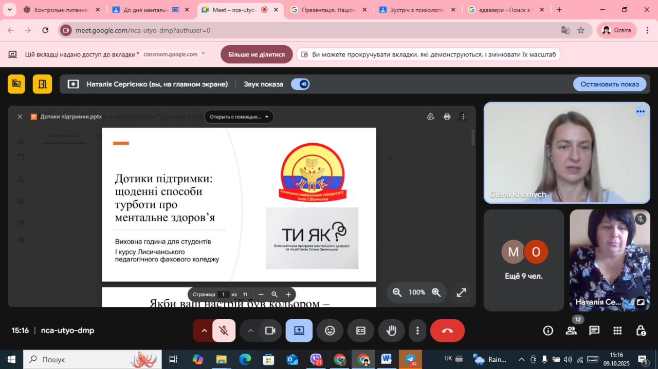 У світі, який змінюється щодня, надзвичайно важливо залишатися поруч — із собою, з іншими, з життям. Саме про це говорили студенти першого курсу Лисичанського педагогічного фахового коледжу під час онлайн-виховної години «Дотики підтримки: щоденні способи турботи про ментальне здоров’я», проведеної в межах Всеукраїнської програми «Ти як?».