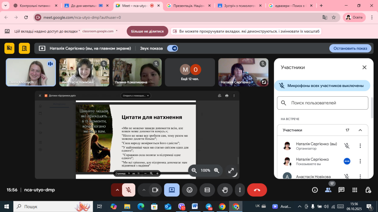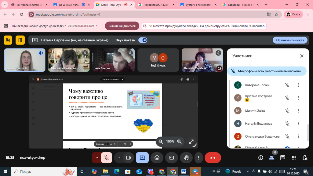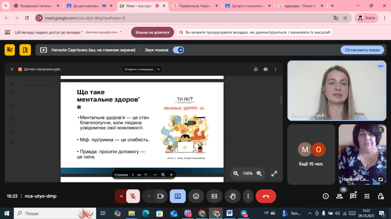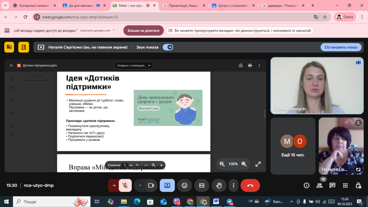У світі, який змінюється щодня, надзвичайно важливо залишатися поруч — із собою, з іншими, з життям. Саме про це говорили студенти першого курсу Лисичанського педагогічного фахового коледжу під час онлайн-виховної години «Дотики підтримки: щоденні способи турботи про ментальне здоров’я», проведеної в межах Всеукраїнської програми «Ти як?».