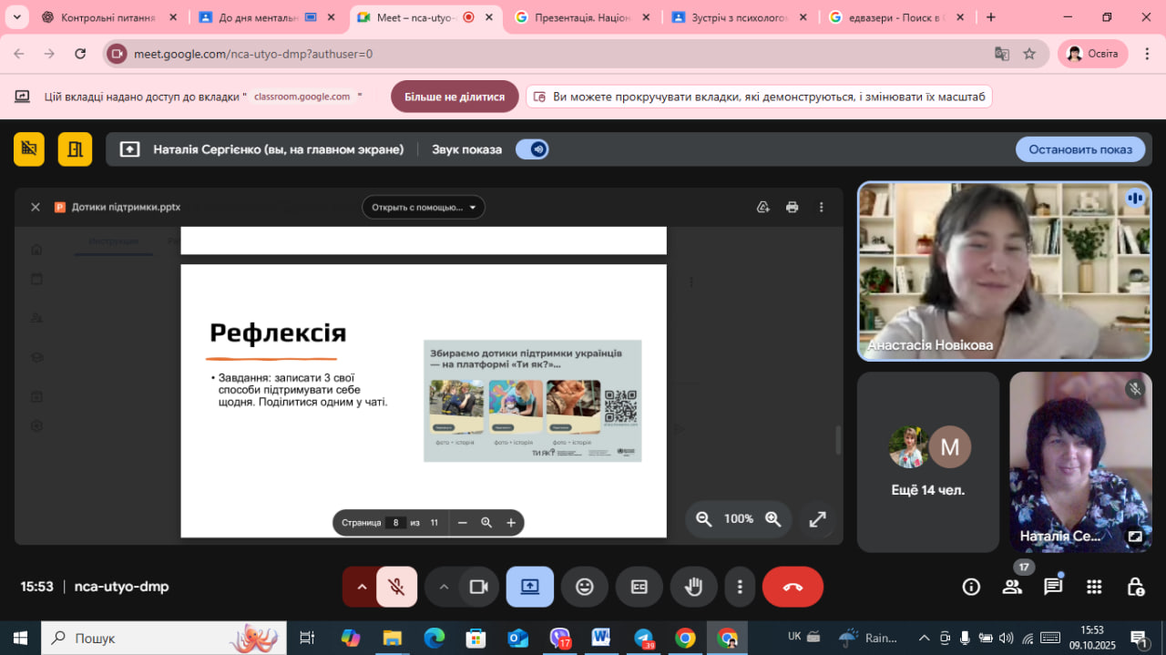 На завершення всі створили свій особистий список трьох «дотиків підтримки» — простих дій, які допомагають залишатися в ресурсі та підтримувати ментальне здоров’я щодня.