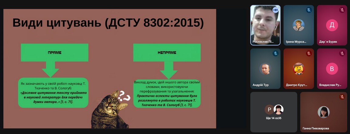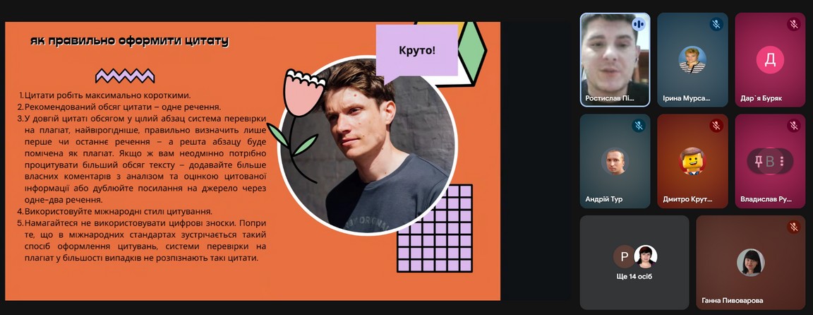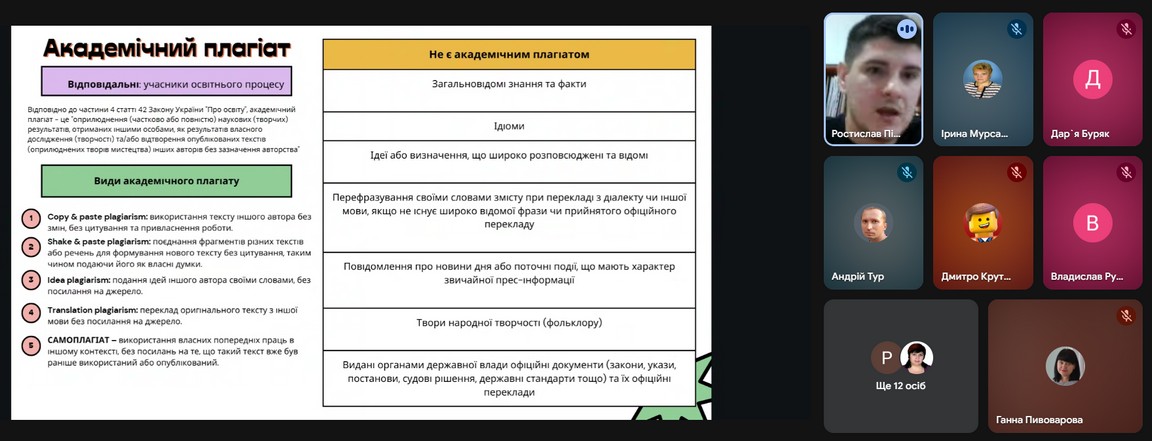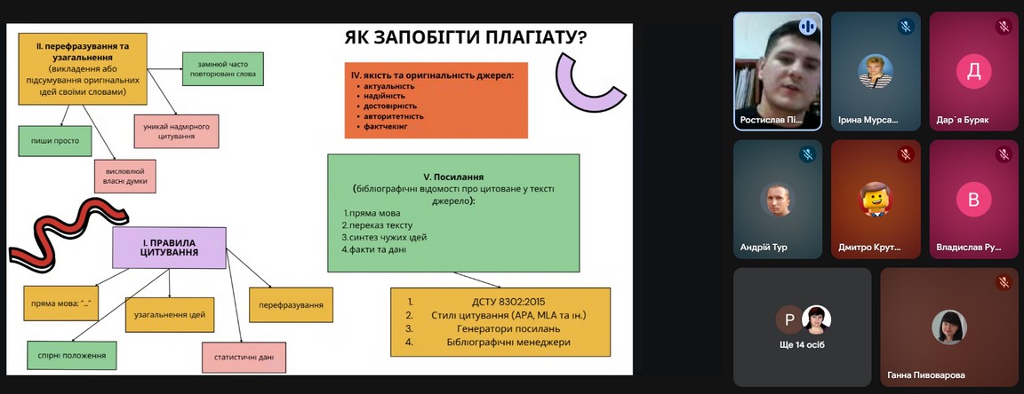 Під час семінару учасники обговорили базові поняття академічної доброчесності, види академічних порушень, зокрема плагіат, фабрикацію та фальсифікацію даних, списування та неналежне цитування. Окрему увагу було приділено правилам використання джерел, оформленню посилань, а також сучасним цифровим інструментам для перевірки оригінальності текстів.