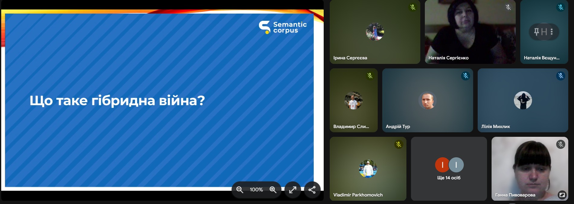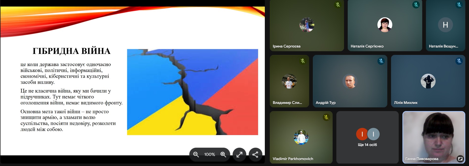 Під час заходу студенти дізналися про те, як змінилася природа сучасних воєн та які виклики стоять перед Україною в умовах багатовимірної агресії з боку російської федерації. Викладачка детально пояснила сутність гібридної війни, що поєднує військові, політичні, інформаційні, економічні та кібернетичні інструменти впливу, а також розкрив поняття багатодоменної війни, яка охоплює п’ять взаємопов’язаних сфер: сухопутну, повітряну, морську, космічну та інформаційно-кібернетичну.