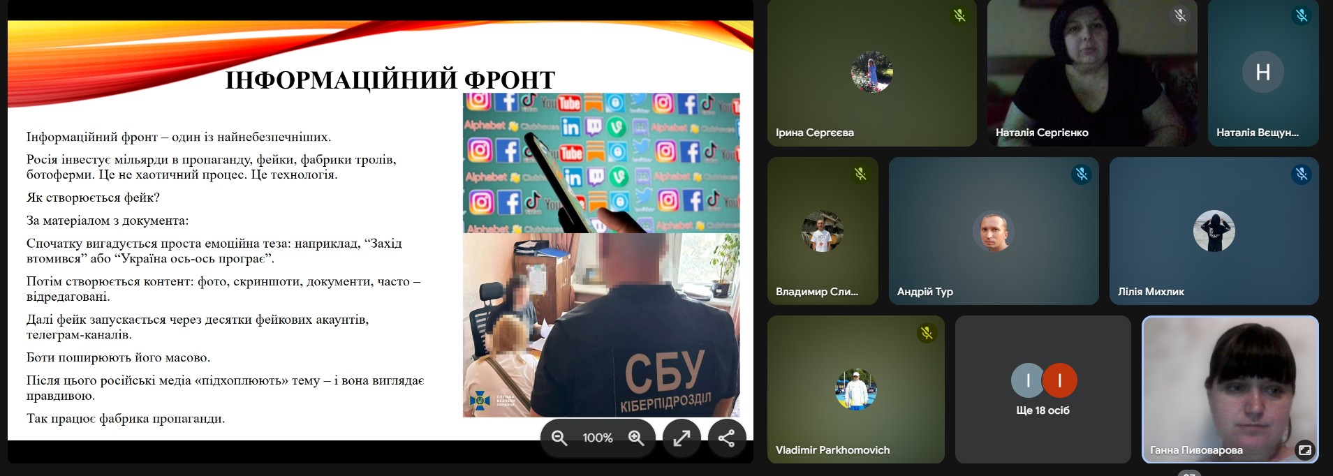 Особливу увагу було приділено темам: інформаційні атаки та механізми створення фейків; типові пропагандистські наративи, які ворог використовує для деморалізації суспільства; приклади кібероперацій проти України; роль кожного громадянина у зміцненні обороноздатності держави; важливість психологічної та моральної стійкості.