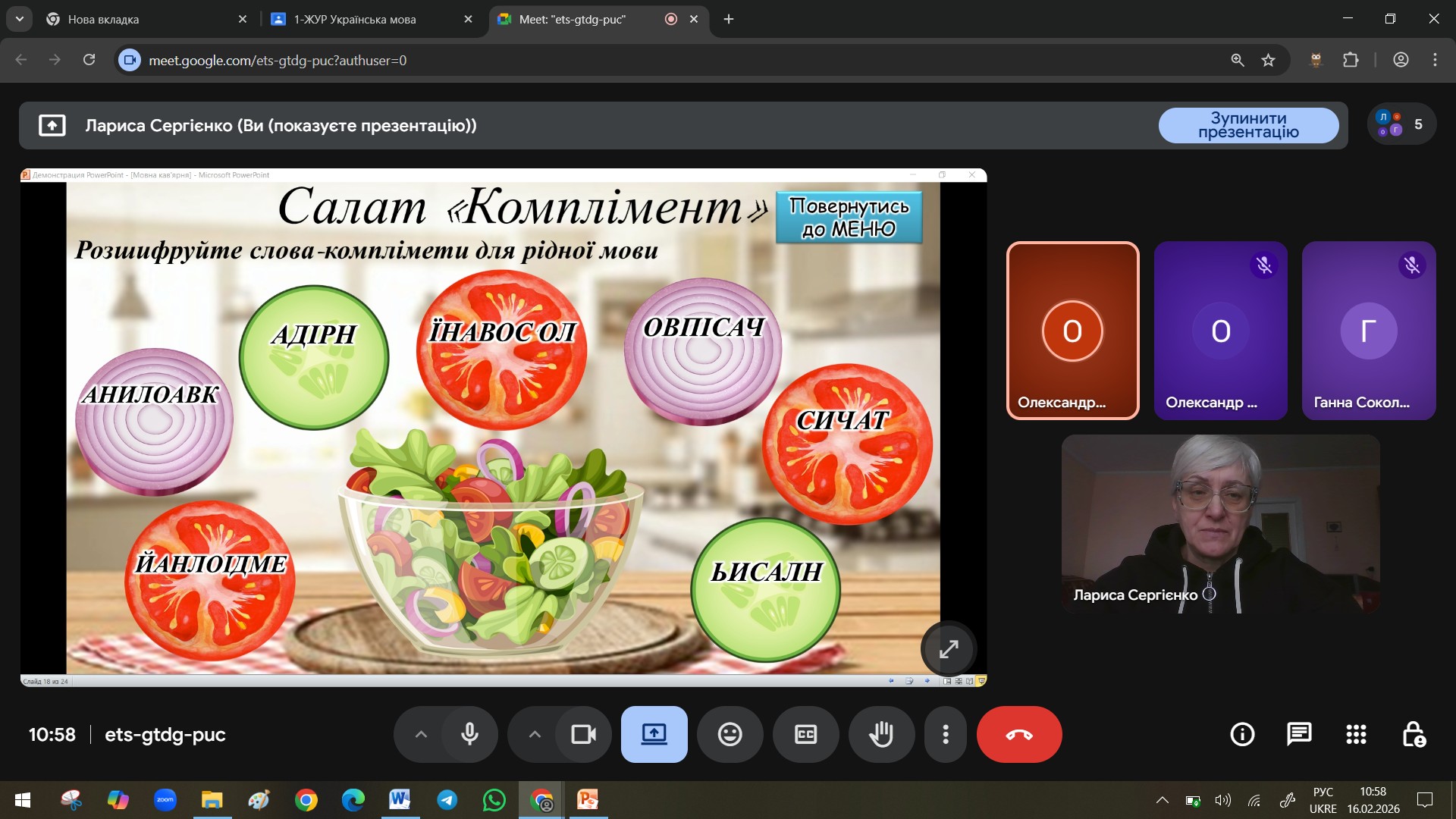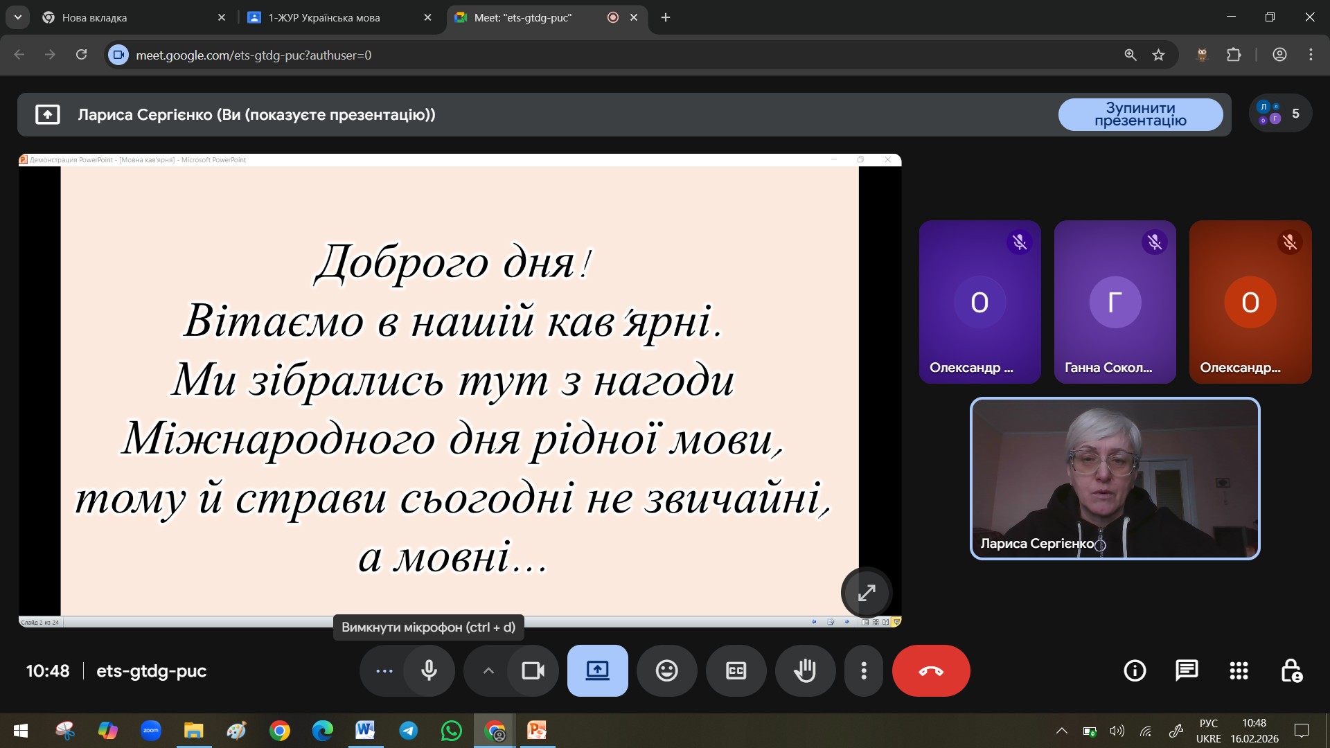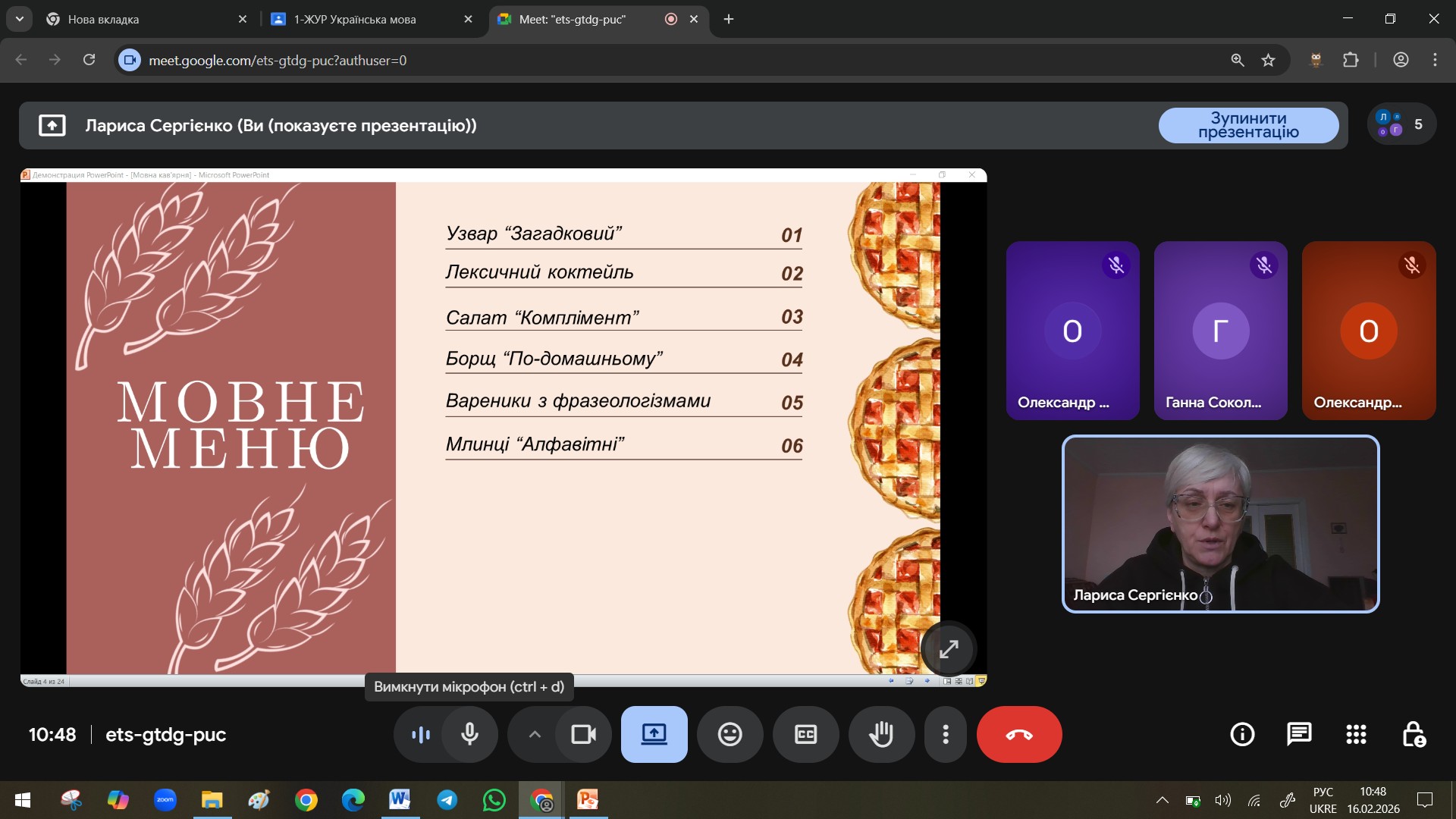 Ось і цього року викладачі провели зі студентами цілий калейдоскоп цікавих та змістовних занять і заходів. Сергієнко Л.В. на заняттях з української мови навіть запросила студентів не за заняття, а в … мовну кав’ярню! Студенти мали змогу «пригоститись» мовним коктейлем, скуштувати борщ «по-домашньому», вареники з фразеологізмами, оцінити смак салату «Комплімент» та млинців «Алфавітних».
