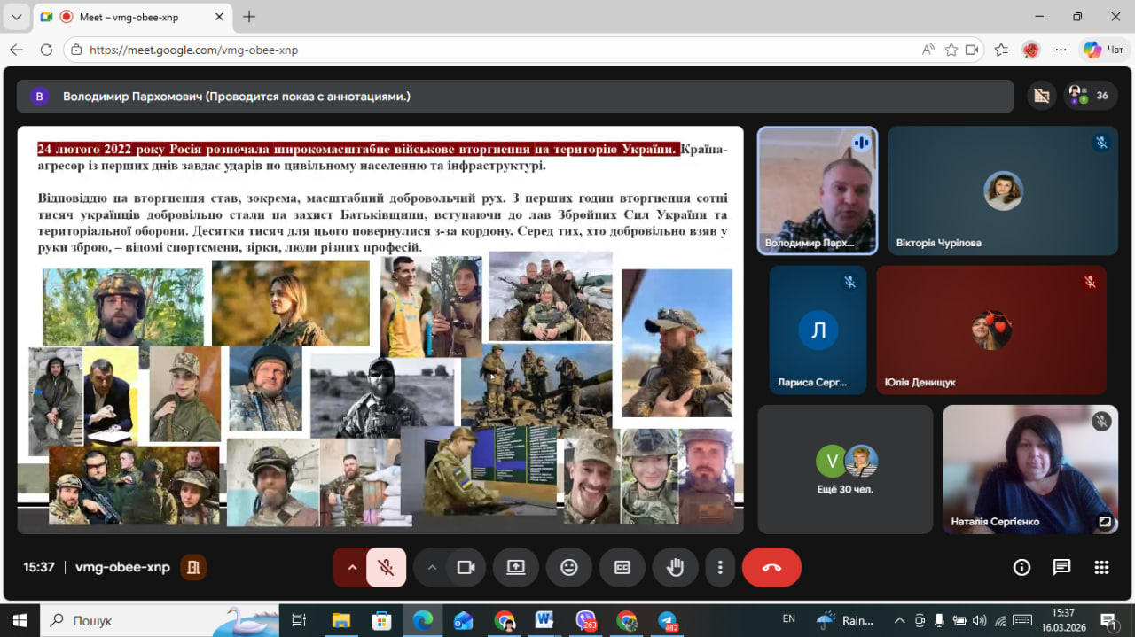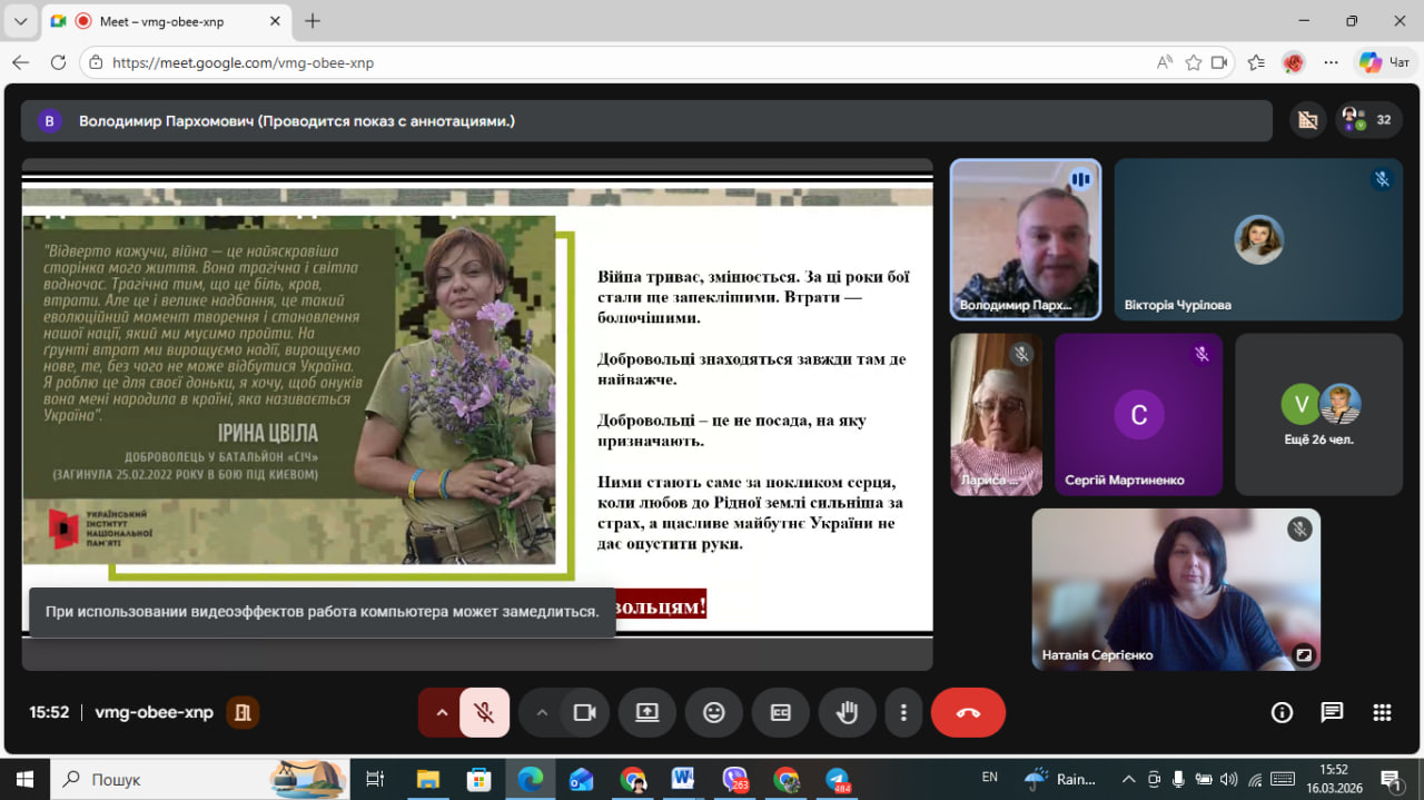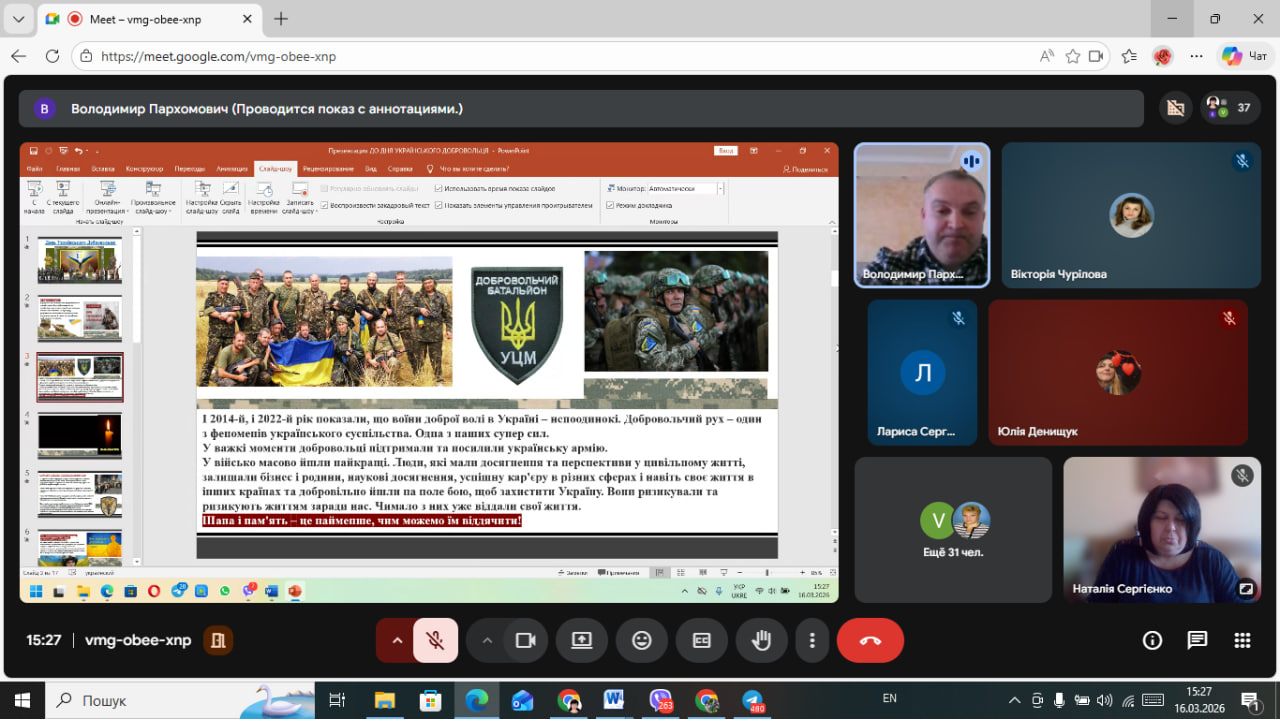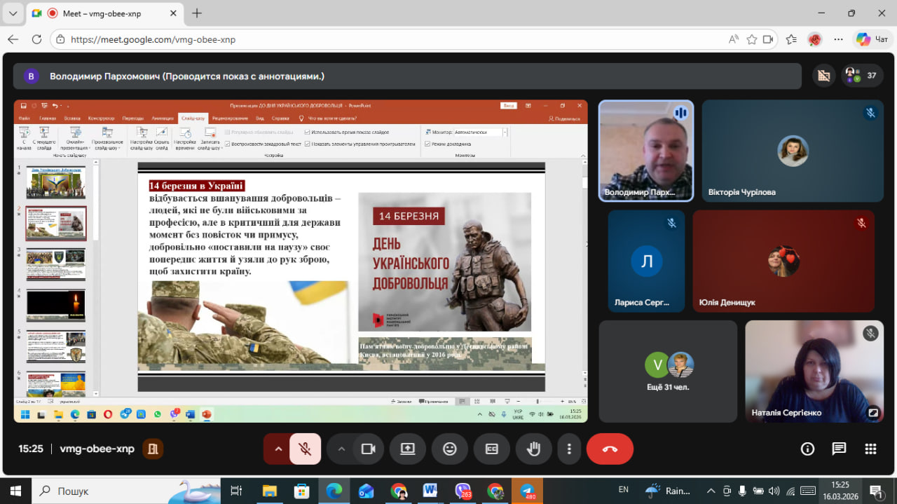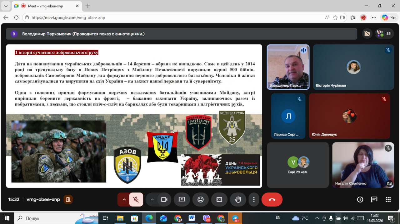 16 березня 2026 року в онлайн аудиторії ВСП «Лисичанський педагогічний фаховий коледж ДЗ «Луганський національний університет імені Тараса Шевченка» відбувся патріотично-виховний захід «Українські добровольці – сміливість, що змінює історію», присвячений до Дня українського добровольця.
