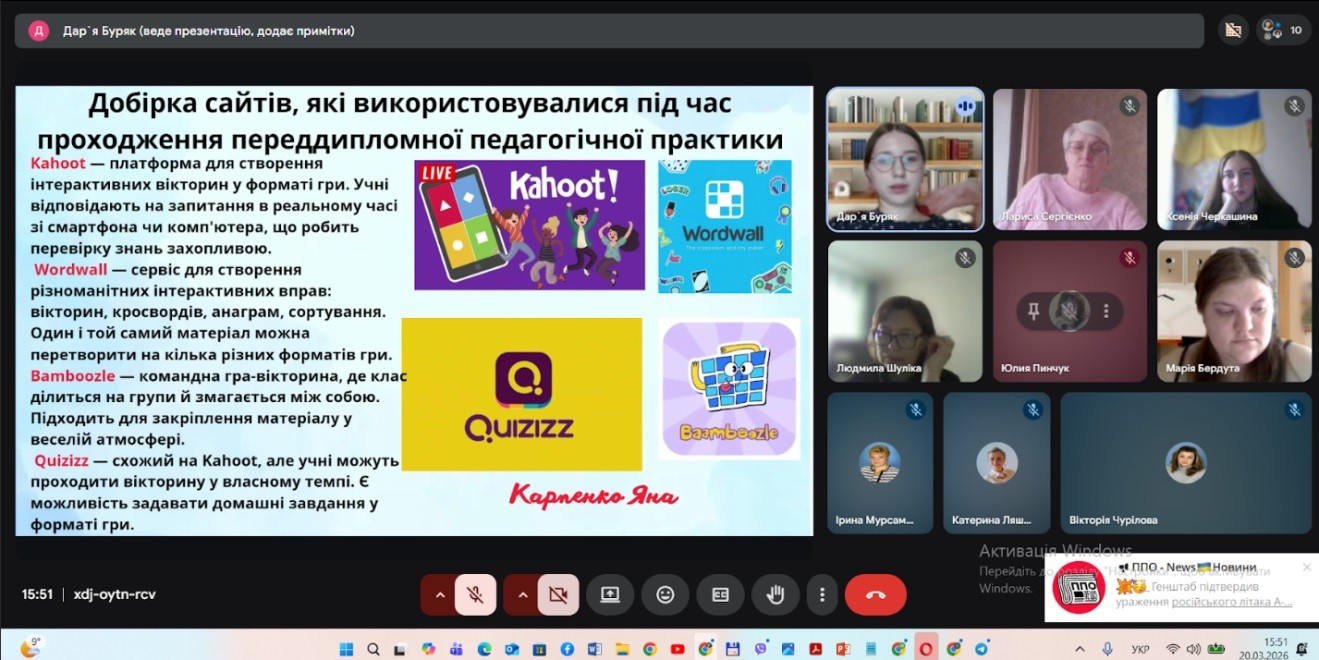 Протягом восьми тижнів студенти-практиканти готували й проводили уроки за розкладом відповідно календарно-тематичного планування. По завершенню практики кожен із здобувачів освіти створив власне методичне портфоліо на Google Drive із дидактичним контентом, що дало змогу визначити рівень професійних навичок і вмінь, здатність моделювати зміст навчання задля формування в учнів ключових та предметних компетентностей, добирати й ефективно використовувати сучасні методики й технології навчання.