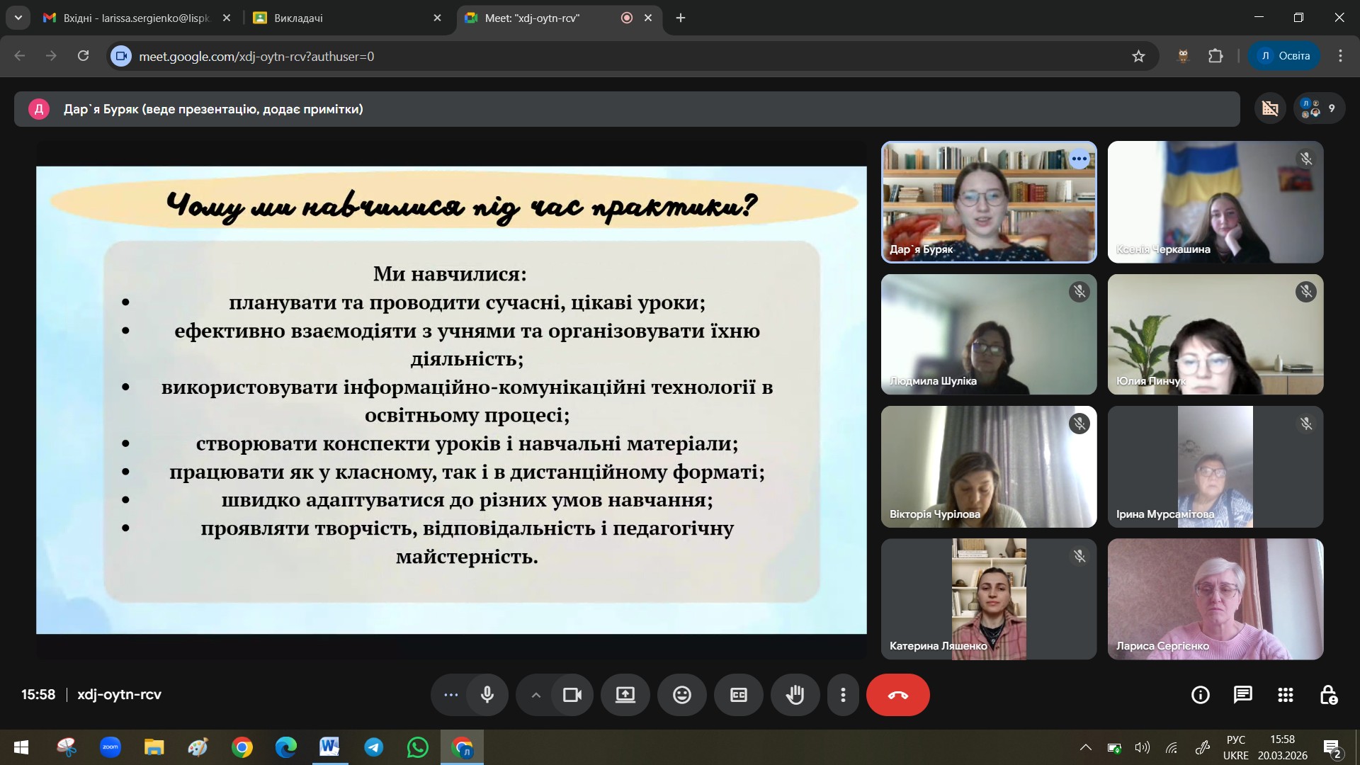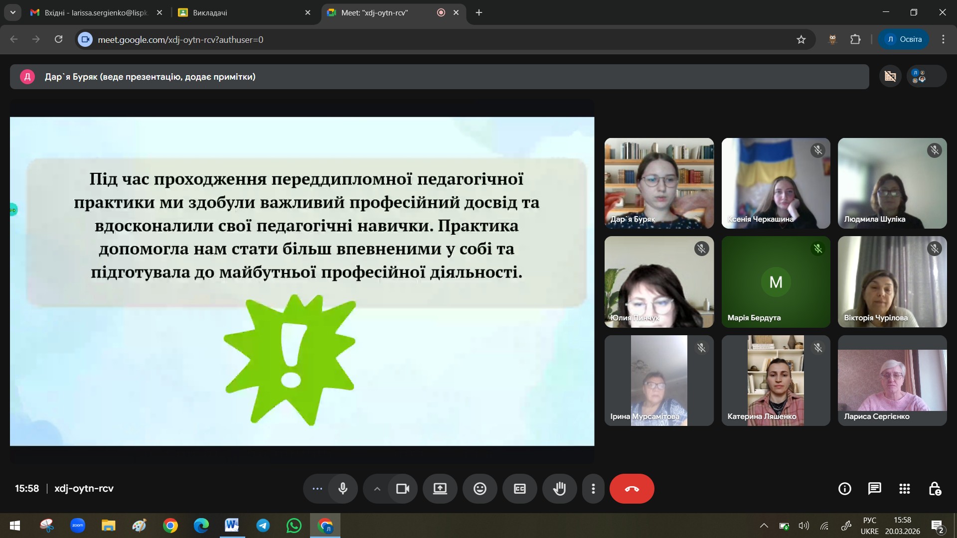 Отже, мету переддипломної педагогічної практики було успішно реалізовано. Усі поставлені завдання виконано. Під час її проходження студенти-практиканти проявили професійну компетентність, педагогічну етику, вміння працювати в команді та використовувати сучасні цифрові ресурси в освітньому процесі.