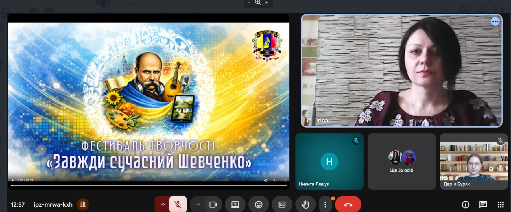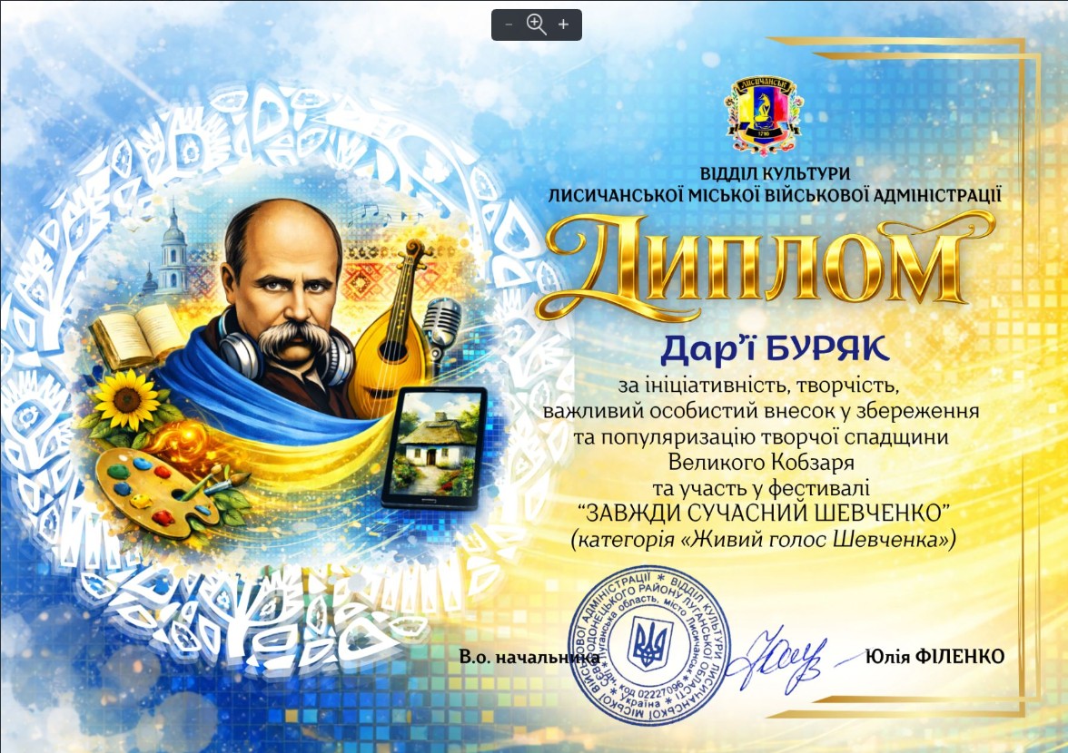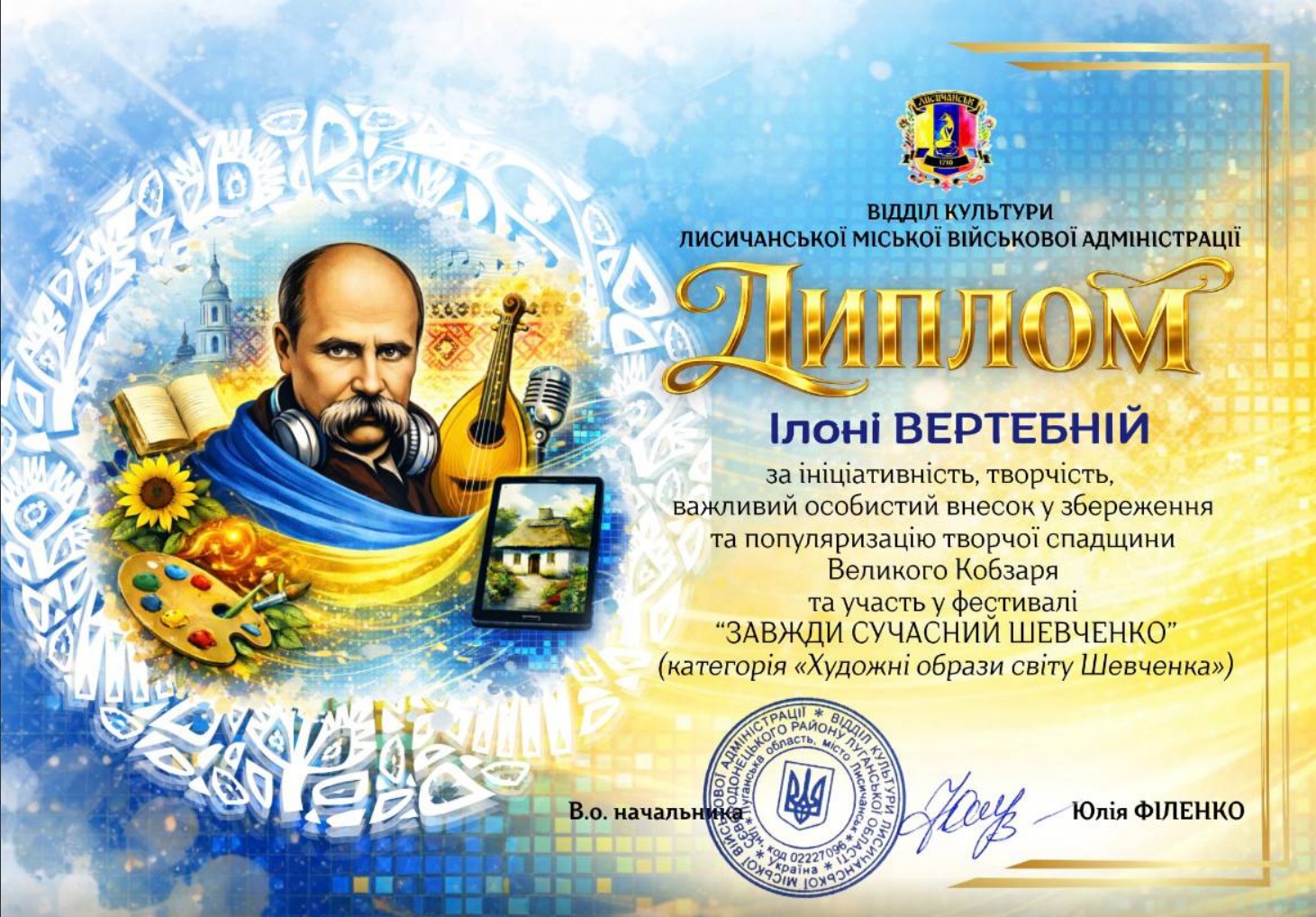 Завершився березень, але не завершується участь наших студентів у різних літературних мистецьких заходах. До дня народження Тараса Шевченка відділ культури Лисичанської міської військової адміністрації анонсував фестиваль «Завжди сучасний Шевченко». Подія об’єднала жителів Лисичанської громади, які перебувають у різних куточках України та за кордоном. Протягом березня до проєкту долучились близько 100 учасників. Серед них і наші студентки Буряк Дар’я (творчий консультант Шуліка Л.В.) та Вертебна Ілона (творчий консультант Сергєєва І.Ю.). Дар’я представила роботу в номінації «Живий голос Шевченка»; Ілона – «Художні образи світу Шевченка». Учасниці були запрошені на підведення підсумків, що відбувалось онлайн та отримали дипломи.