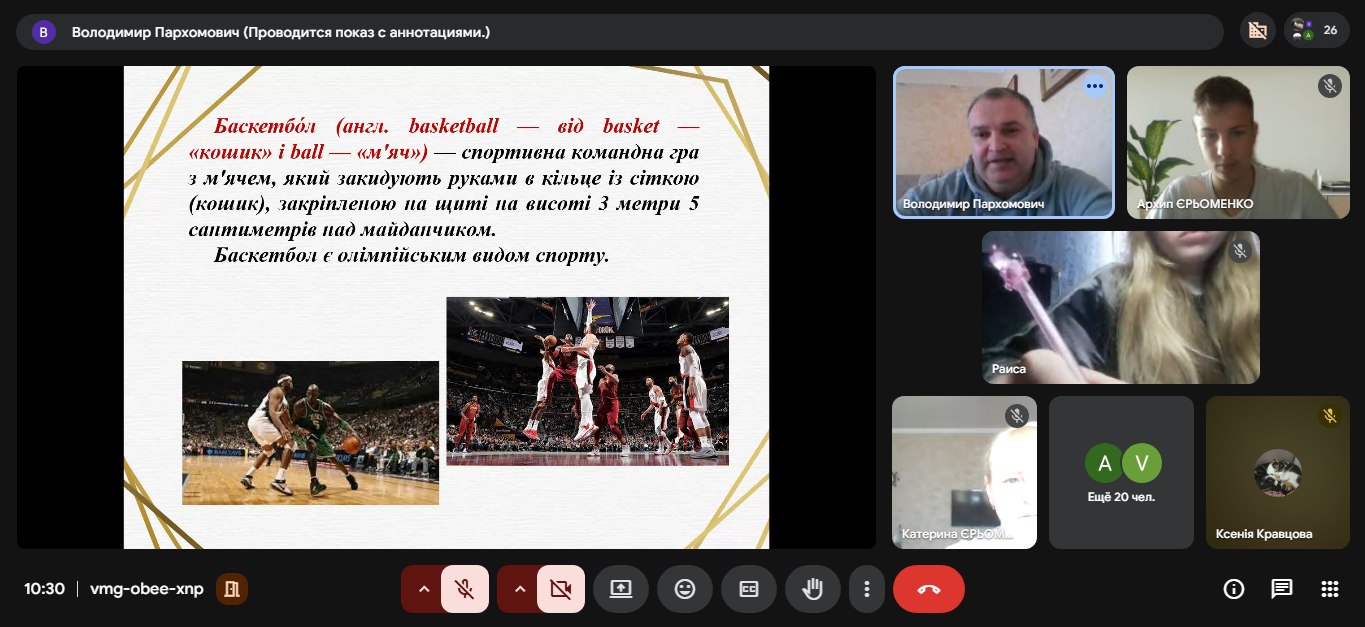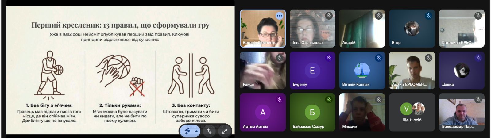 Здобувачі освіти на першому занятті ознайомилися з історією розвитку баскетболу у Світі, від часів племен інків, майя та ацтеків, які грали в схожу до баскетболу гру «Пок-та-пок» до часів доктора Джеймса Нейсміта, який винайшов сучасний баскетбол та подальших етапів розвитку баскетболу у Світі. А також змогли перевірити свої баскетбольні знання на цікавому ігровому онлайн майданчику, де відповідаючи на тематичні запитання здобували залікові бали. Перший «баскетбольний батл» сезону завершився з рахунком 5,5/4,0 бали на користь учнів з Сіверськодонецька, які на останньому завданні випередили суперників з Комишувахи. Не дивлячись на результат, команди показали високий рівень знань, жагу до перемоги, дружню атмосферу та єдність. Окремо висловлюємо щирі слова подяки представникам закладів загальної середньої освіти – вчителям фізичної культури Євгенії ШЕВЧЕНКО і Катерині Єрьоменко за допомогу в організації та проведенні заходу.